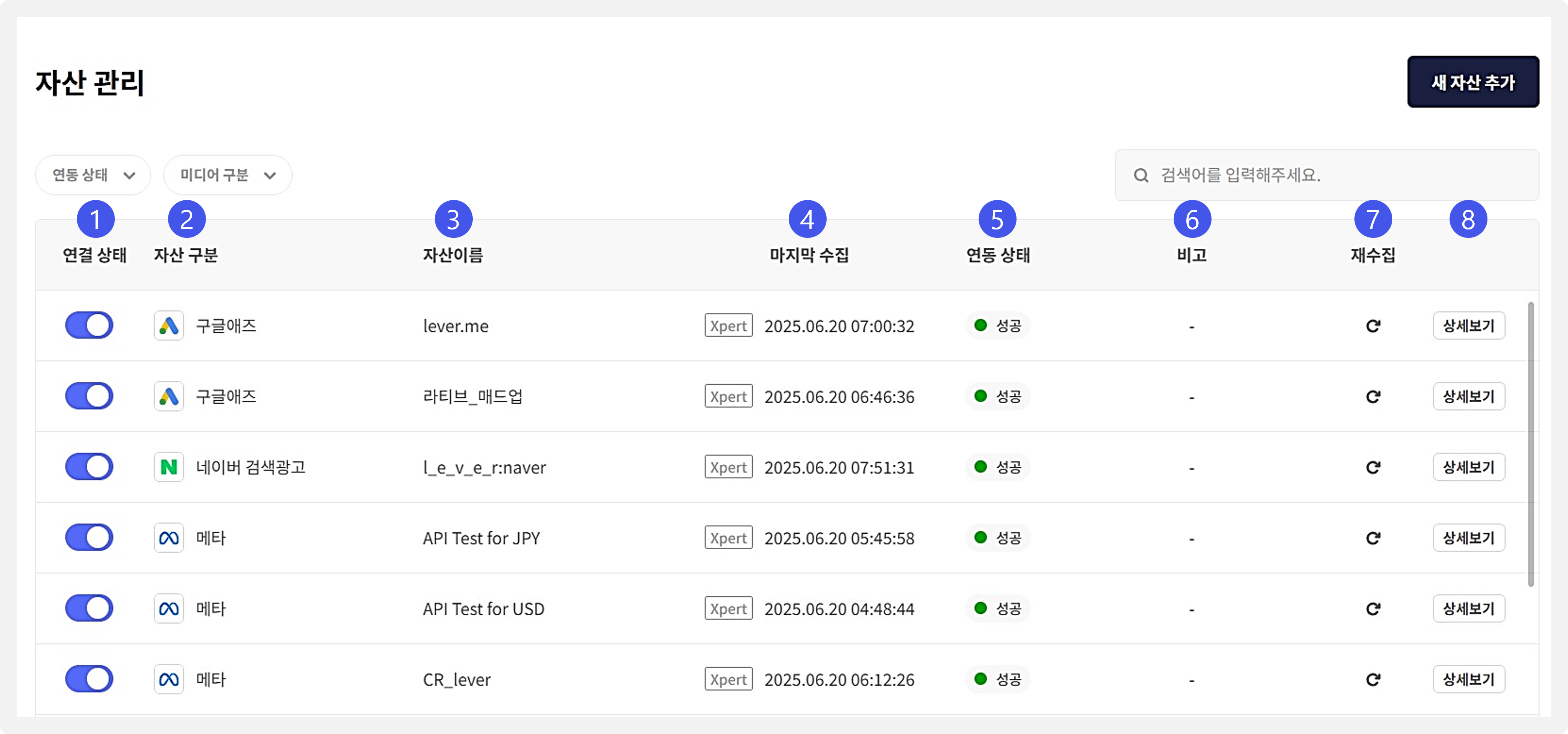 자산(매체/트래커)이 엑스퍼트와 연결되었는지 확인할 수 있습니다.