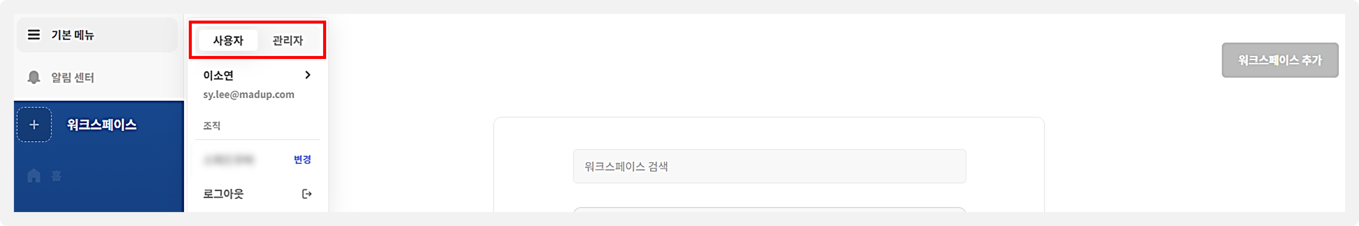 1. Xpert 로그인 후 관리자 권한이 부여된 조직으로 이동 시, 우측 상단의 기본 메뉴를 클릭하면 사용자 및 관리자 페이지 버튼이 노출됩니다.